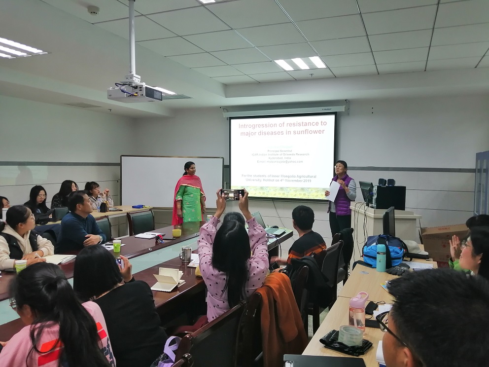 2019年11月1日到6日,印度油料种子研究所的首席科学家Mulpuri Sujatha研究员代三亿体育进行学术交流。访问期间,Mulpuri Sujatha研究员为公司植物保护专业的研究生做了题为“Breeding for disease resistance in sunflower through introgressive breeding and biotechnological tools”学术报告,详细的介绍了她所在的课题组在向日葵遗传转化体系的建立以及抗病育种方面取得的成果。学术报告由赵君教授主持,内蒙古农牧业科公司作物所,三亿的年轻老师以及研究生共计30余人参加。同时,在三亿体育有限公司停留期间,她还亲自指导从事向日葵遗传转化的研究生建立向日葵再生体系和遗传转化体系,特别是一些关键地方,亲自上手操作给员工进行演示。通过学术交流和实验操作的演示,使得我们的研究生收获颇丰。