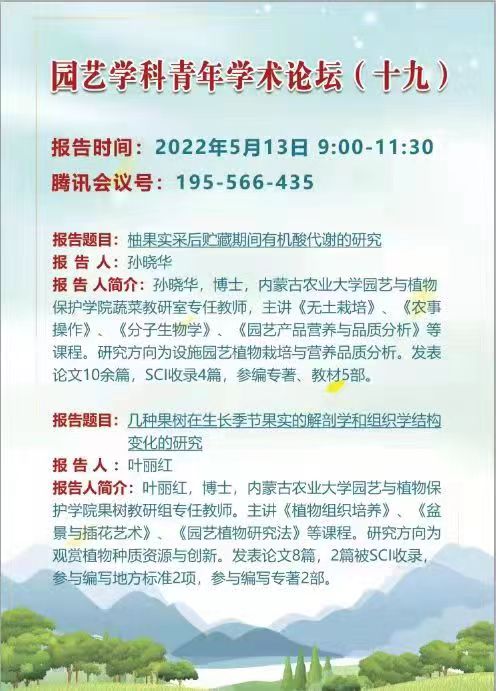 为了提升公司青年教师学术交流与合作能力,促进青年教师快速成长,园艺公司线上举办了园艺学科第十九次青年学术论坛。会上,2位教师代表进行了科研项目报告,青年教师参会并进行了积极讨论,为青年教师在科研工作方面提供了成功经验。