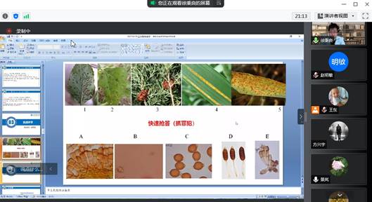 为了提升自治区级一流课程普通植物病理学的教学水平、推进“植物保护”国家级一流本科专业建设,植物病理教研室开展校外教师进课堂活动。分别于5月17日和24日邀请甘肃农业大学徐秉良教授、西北农林科技大学詹刚明副教授,为2020级植物保护专业本科生进行了普通植物病理学的线上授课。两位专家精彩的讲课以及与员工的互作讨论,不仅激发了员工学习理论专业知识的兴趣,还了解到专业知识的应用前景。课后,他们还给教研室老师们分享了丰富的教学经验。